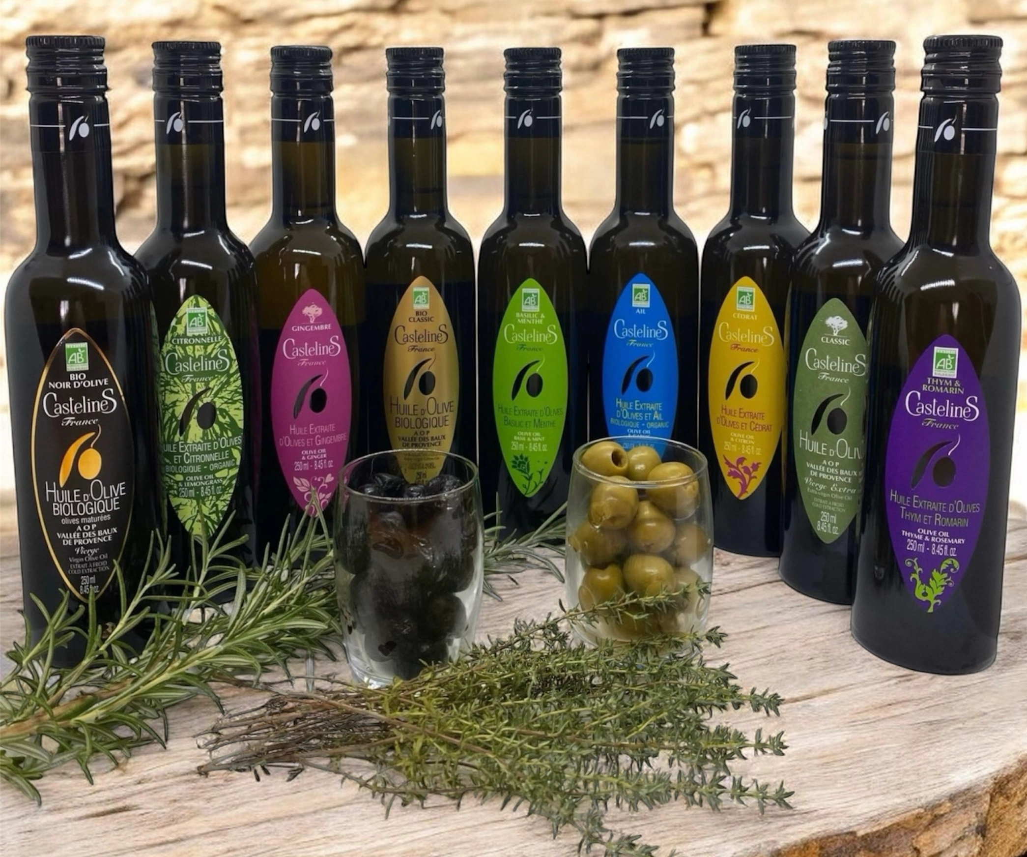 Les huiles aromatiques Castelas sont conçues avec une exigence identique à celle des huiles d’olive du domaine. La base est toujours une huile d’olive de grande qualité, issue des olives cultivées dans les Alpilles. Les aromates sont ensuite intégrés selon des méthodes respectueuses du produit, afin d’obtenir un équilibre subtil et naturel.